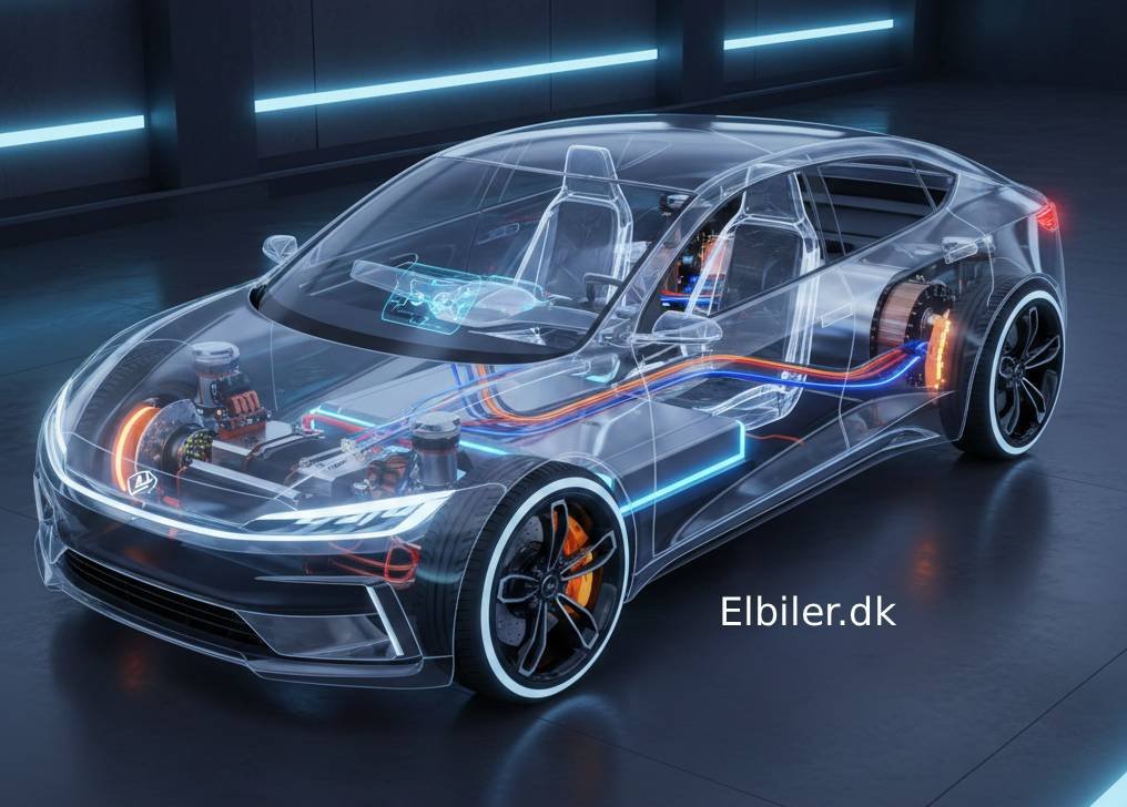 Denne grafik giver et “røntgenblik” ind i de vitale dele, der omdanner strøm til bevægelse i en moderne elbil. Her er en gennemgang af komponenterne vist på illustrationen:
